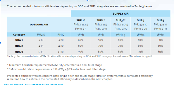 Bước 2: Theo hướng dẫn của Tiêu chuẩn Châu Âu Eurovent 4/23 – 2017 và WHO ta chọ đươc lọc tinh/hepa và lọc than hoạt tính trong 2 bảng dưới đây:
